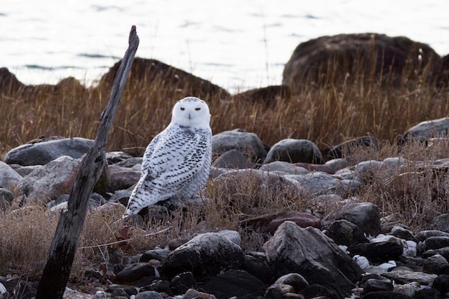 Check out this big-eyed beauty. It’s a snowy owl hanging out on the jetty by Goldsmith’s Boat Shop in Southold this week.