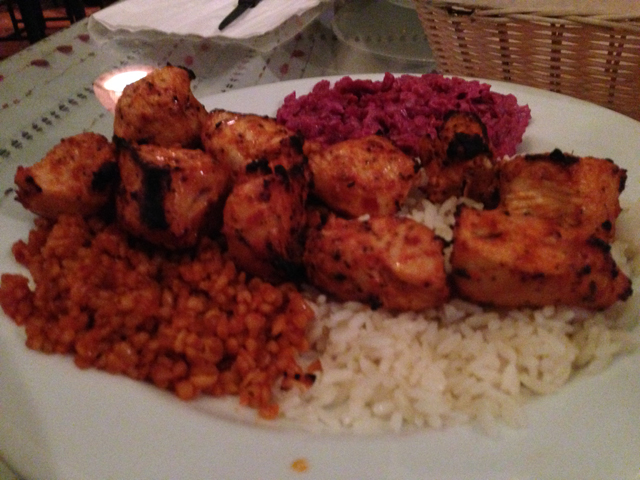We sat down and our waiter rolled her eyes at me and smiled. It was the usual again: a chicken shish-kebab, seasoned and tender, with white rice, beet salad and a heaping pile of bulgur, a wheat dish popular in Middle Eastern and Mediterranean cuisine.