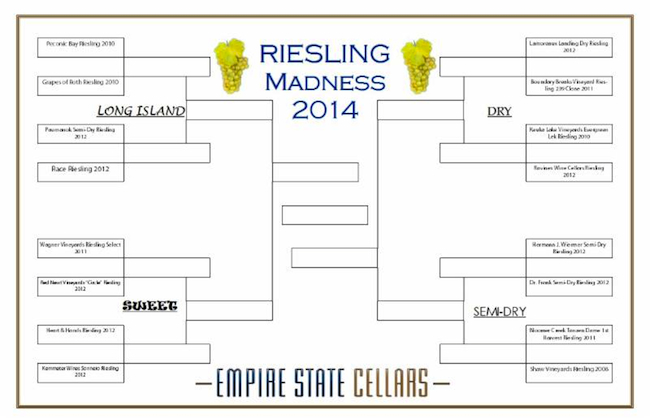 Paying tribute to the “madness,” Empire State Cellars is hosting a month-long wine bracket to narrow down the best riesling produced in New York State. The Sweet 16 Riesling Tournament, which started on Feb. 22, is now in its second round.