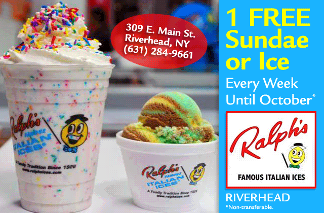 Need a Summertime ice cream fix? Come down to Ralph’s Italian Ice in downtown Riverhead! Serving over 130 flavors of Italian ice, frozen yogurt, hard/soft ice cream, smoothies, shakes, and other delicious frozen drinks that are sure to satisfy any craving! Riverhead Ralph’s will also cater any party or event! Call 631-284-9661 or stop on by! (located next to the Aquarium in downtown Riverhead) Make sure you check out our Facebook page for daily specials and promotions!