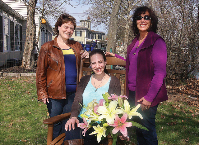 Donna Burden (left), Mattituck Florist owner Danielle LaScala (cengter) and farmer Maryann Krupski in the garden area of the florist where part of the farmers market will be held. (Credit: Barbaraellen Koch)