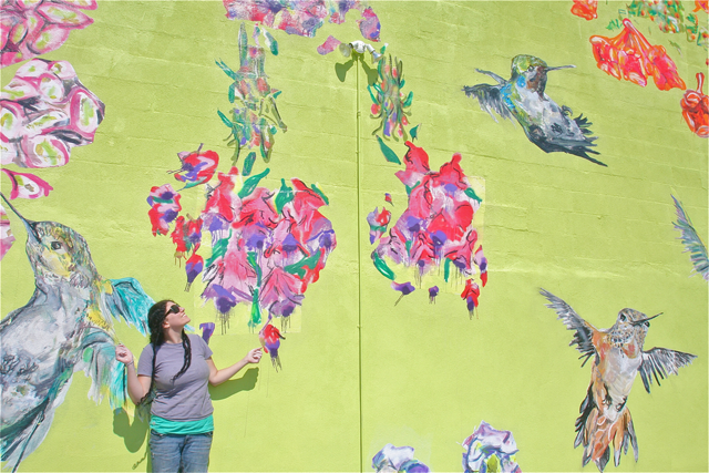 Wearing paint-speckled sunglasses she has donned during the 200 hours spent painting downtown Riverhead, artist Caitlyn Shea, 28, of Melville put the finishing touches on a large-scale mural of flowers and hummingbirds Tuesday afternoon.