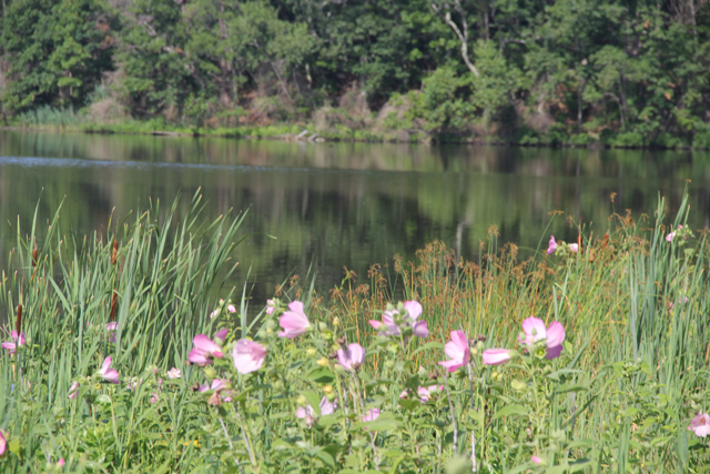 “This is the most beautiful we’ve had it,” said East Marion resident Jack Luscher while pointing to native pink flowers, known as hibiscus moscheutos, scattering the water’s edge Tuesday morning.