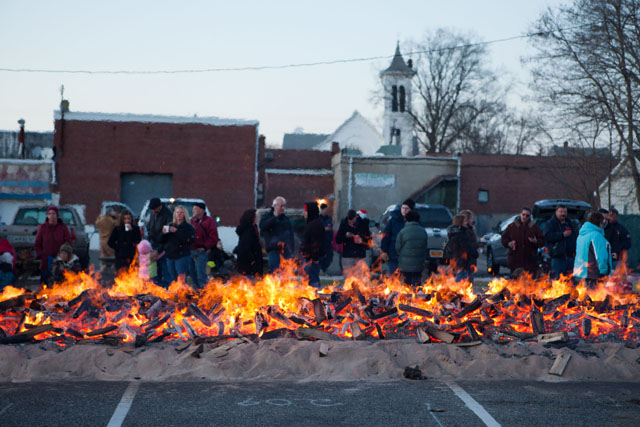 Gathering around the bonfire.The Nativity set up along the waterfront.Gary Joyce gathers another load of wood for the fire.Free hot chocolate for everyone.Santa’s gingerbread house.As night falls, the fire burns brighter.Keeping the floating fires burning.From left: Thomas Wiliams, 8, Matthew Densieski, 9, Vinny Duran, 9, and Ryan Densieski enjoy their hot chocolate.Train rides along the river.Santa’s boat arrives.Santa waves from the boat.Lighting the tree.Giavonna Scharf, 8, of Jamesport talks to Santa.
