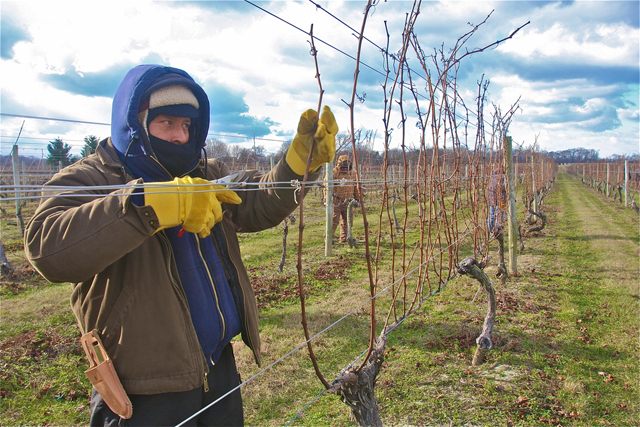She’s posted a photo on Facebook Tuesday of the workers with the following caption: “Winter pruning at Bedell Cellars, the first over a million hands-on interactions with the vines in 2015.” When asked what this means she explained that over the course of the growing season each vine is touched by hand around 11 times. Starting with pruning, tying, shoot thinning, suckering,wire lifting (3 times) and shoot positioning, hand pulling leaves, fruit thinning and picking.