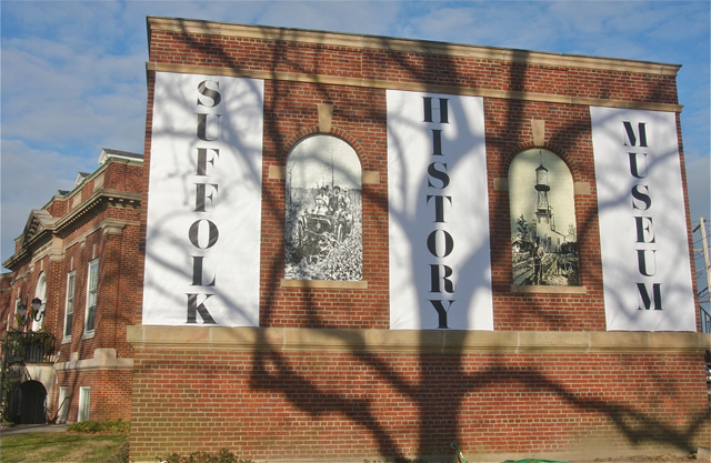 The banners, measuring 12-feet 8-inches tall by 5-feet 6-inches wide, spell out ‘Suffolk History Museum’ on each side of the building.