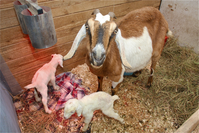 The first goats of the year were born at Goodale Farms of Aquebogue on Wednesday. The twin boy kids, born to three-year-old mom Ivy, weighed between three and four pounds and were resting and nursing inside a barn under heat lamps with straw.