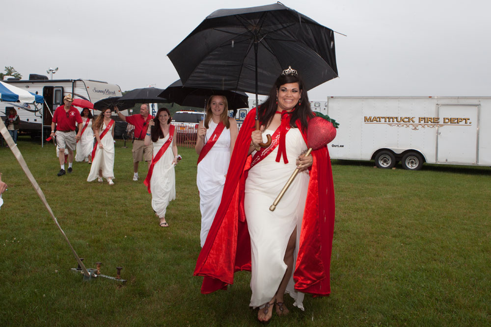 Janet Brala and her improvised rain hat. (Credit: Katharine Schroeder)Cayleigh Orlowski, 5, of Mattituck shows off a juicy strawberry. (Credit: Katharine Schroeder)The Talanki family from Setauket enjoys strawberry shortcake. (Credit: Katharine Schroeder)Volunteers Ka Shya Hawkins, 9, and her mom Gwen, both of Mastic Beach. (Credit: Katharine Schroeder)Volunteer Bob Celic. (Credit: Katharine Schroeder)Chocolate covered strawberries. (Credit: Katharine Schroeder)Volunteers Liz Sullivan of Malvern with Joseph Pagano of Peconic. (Credit: Katharine Schroeder)Members of the North Fork Academy of Dance perform. (Credit: Katharine Schroeder)Contestants take shelter from the rain. From left: Mercedes Edwards of Greenport, Cora Small of Southold, Caroline Keil of Mattituck, 2014 Strawberry Queen Jasmine Clasing, Charley Claudio of Mattituck, and Jackie Davey of Southold.(Credit: Katharine Schroeder)Runner-up Jackie Davey of Southold. (Credit: Katharine Schroeder)The newly crowned Strawberry Queen, Caroline Keil of Mattituck. (Credit: Katharine Schroeder)Caroline Keil is interviewed by WLNG radio’s Dana Kallio.(Credit: Katharine Schroeder)The 2014 Strawberry Queen Jasmine Clasing and Caroline Keil. (Credit: Katharine Schroeder)The 2015 Strawberry Queen, Caroline Keil. (Credit: Katharine Schroeder)