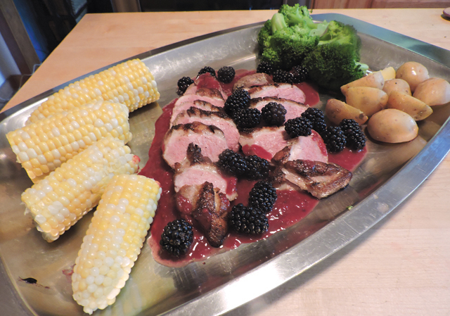Place the sauce on a plate with the sliced duck on top. Garnish with fresh blackberries.