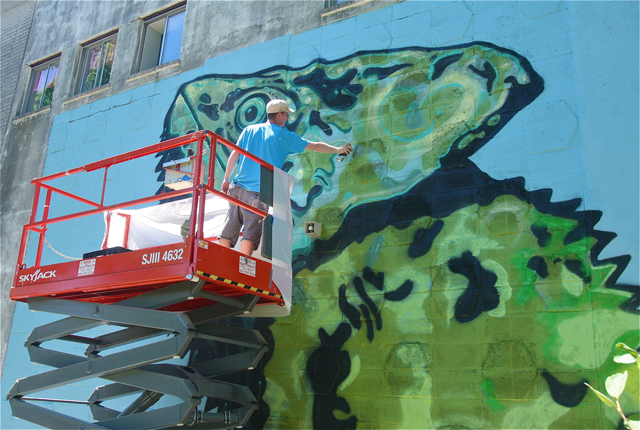 Artist Drew Kane of Huntington, painted his “Chameleon Mural” last weekend on the side of Consignment Galore at 54 East Main St.