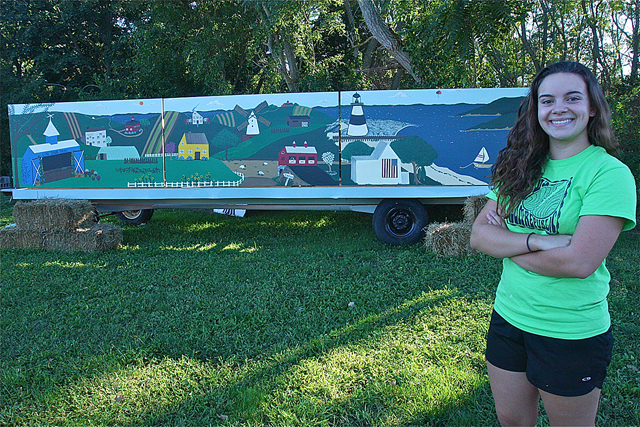 So instead of expanding the size of her operation, Cirillo enlisted the help of her part-time worker and Laurel resident Raven Janoski, 17, who has a great interest and aptitude for art. Raven, a Mattituck High School senior, came up with the idea for a giant postcard with a “folk art rendition and a Long Island feeling,” referencing landmarks from all around the North Fork and making them her own.