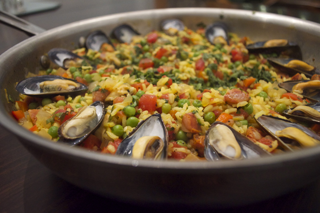 Soak 1/2 teaspoon of saffron threads in hot mussel broth and add to the pan. Cover, lower the heat and simmer until the rice is tender, about 15 minutes.