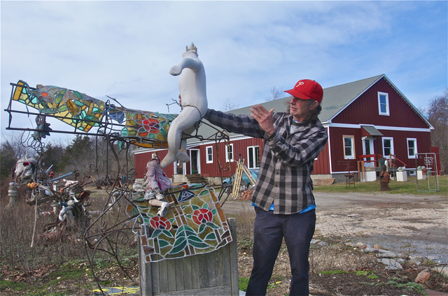 Driving by recently, I noticed some found object 3-D collages near the front of his property. He said he just moved 22 pieces, which he refers to as assemblages, from the back of the property for two reasons — one practical and one artistic. First it keeps people from driving on his lawn and second, they are more visible out front.
