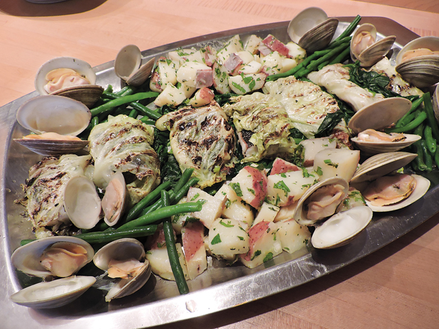 Meanwhile, add 12 littleneck clams to the fish broth in the saucepan, cover and bring to a boil. As the clams open, remove them and set aside.