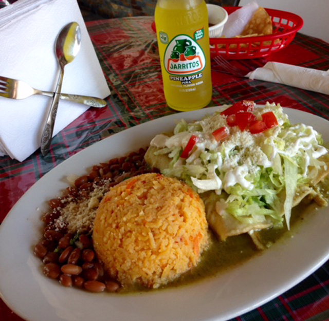 I ordered the enchiladas verdes — three corn tortillas filled with chicken and cheese, topped with green enchilada sauce, sour cream and crumbled cheese, and served with rice and & beans for just $10. They also served complimentary tortilla chips with a bean dip.