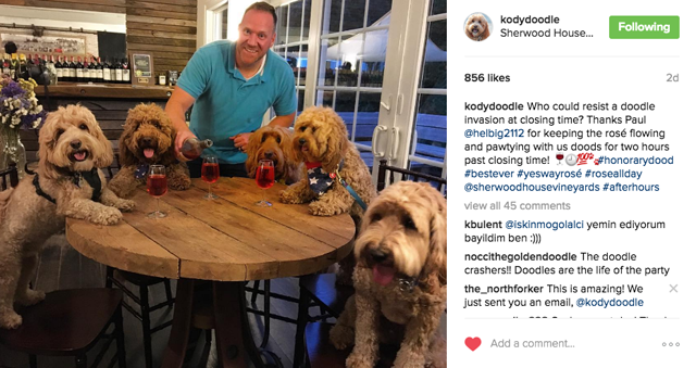 In one photo Kody and his doodle buds Bailey, Charlie (@baileydoodle), Reilley (@the_life_of_reilley) and Teddy (@teddygramnyc) — all of which have amassed sizable social media followings — are seen gathered around a table in the Sherwood Vineyards tasting room in Jamesport on Sunday.
