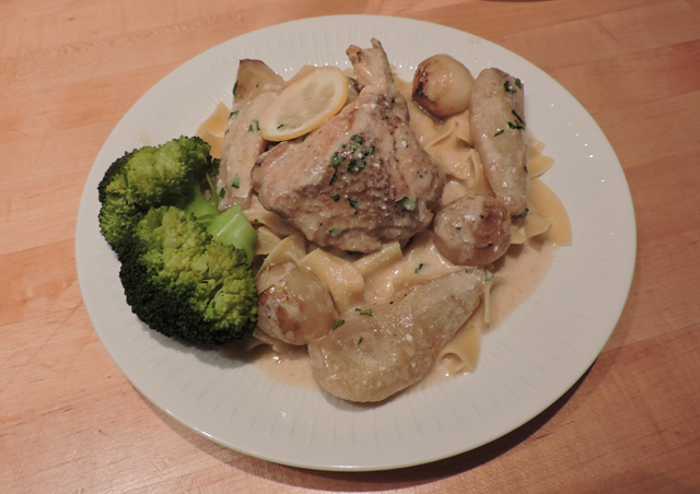 While the chicken is cooking, peel, core and cut into quarters 4 Bosc pears (or substitute tart apples), then add them to the dutch oven. Continue cooking in the oven for 45 minutes. Remove the pot from the oven and transfer the chicken, pears and onions to a large casserole and keep warm.
