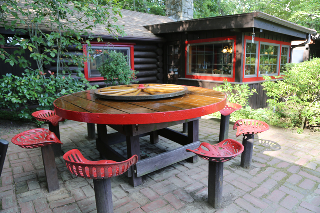 Outside, on the patio, the house features a table topped with a lazy Susan crafted from a wagon wheel, surrounded by chairs that were once tractor seats. Nearby is a tiki bar.