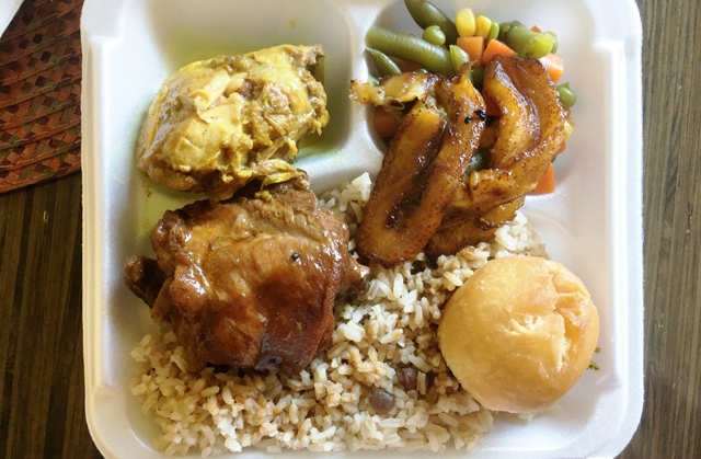 On a recent visit we chose the lunch special ($7.99), which comes with two pieces of chicken (in our case, one curry, one stewed), rice, vegetable and plantains. The portions are ample for the price, but you probably won’t have much left over. It’s an enticing mix of flavors, although one that is light on heat.