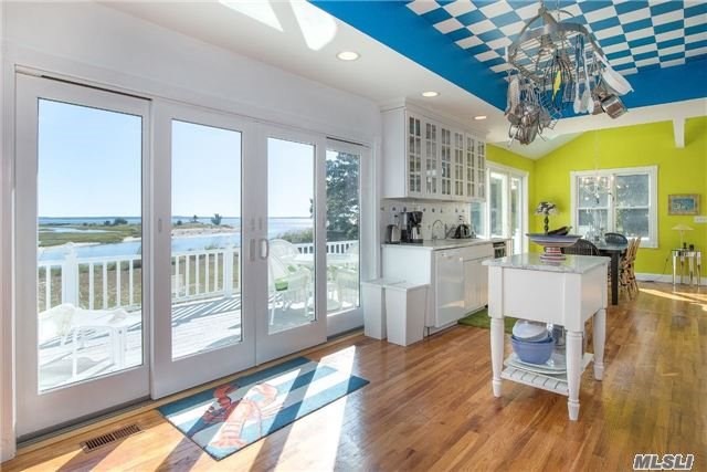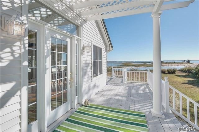 As eye-catching as the interiors are, they are no match for the 180-degree views of the Peconic Bay that are visible from most rooms and, perhaps, best enjoyed on the home’s large deck. The cottage’s 120-feet of private beach is just steps away, providing convenient access for kayaking, swimming and paddle boarding.