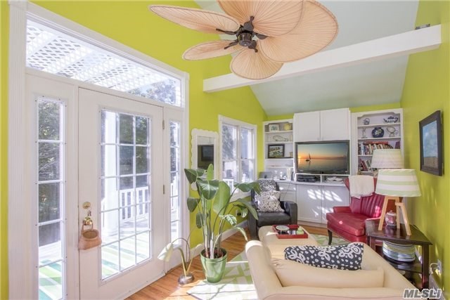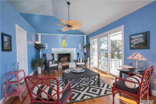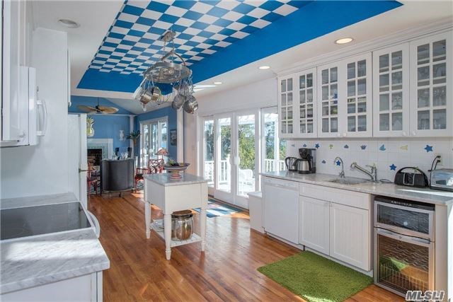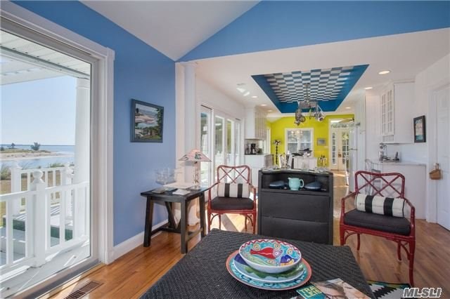 Bright green and blue walls with white accents illustrate a fun, beachy vibe in a perfectly polished manner. The sophisticated tongue-in-cheek decor was enough to catch the eye of Coastal Living Magazine editors who featured the property in a past issue. “It was designed with family and entertainment in mind,” said listing agent Maureen Sullivan, of Daniel Gale Sotheby’s International Realty. “People really enjoy gathering here.”