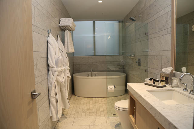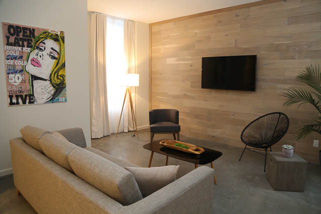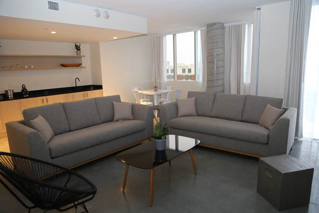 Each floor of the hotel has two one-bedroom suites and two studio rooms. The fifth floor has a larger hospitality suite, with a view overlooking the Hyatt Place East End and Long Island Aquarium across the street.