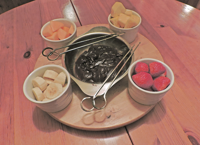 Note: Back in the ’70s and ’80s, everyone had a fondue set but most of them were disposed of long ago. If you still have one, use it, but if you don’t you can improvise as I did with no negative effects. Just put the chocolate in a warm oven before serving.