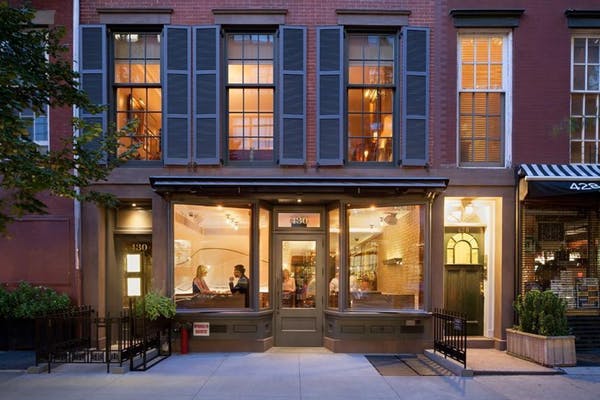 The bar and restaurant strikes a mix of cozy and polished with barnwood floors and vintage brass fixtures. A color palette of deep blue, green, maroon, gold and cream play off one another for a chic vibe representative of the West Village neighborhood.