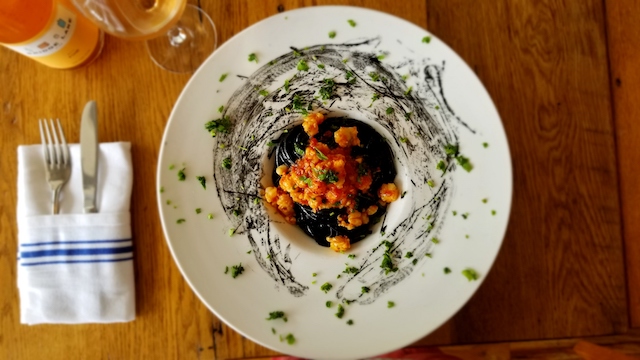“It’s my most conceptual dish on the menu as it is purely meant to represent summer, and pairs beautifully with a local rosé,” he said. “I utilize spaghetti, tossed in squid ink from Point Judith, topped with chopped white shrimp tails in a piquant white wine and San Marzano tomato sauce. It has a little heat, a little brine and a little funk. It brings you right to a sunny Peconic beach day at first bite.”