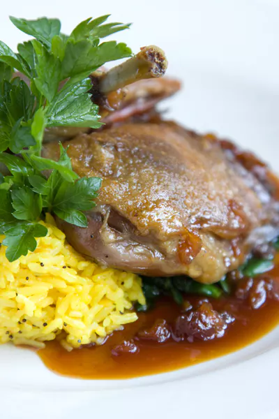 This summer, Terry invites you to try one of his favorite dishes to make: Crescent Farms Duck Confit with lemon spinach, coconut rice, strawberry-rhubarb chutney and natural port reduction.