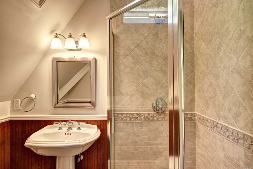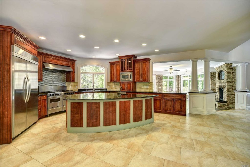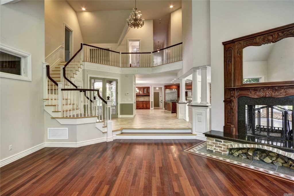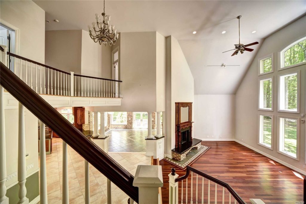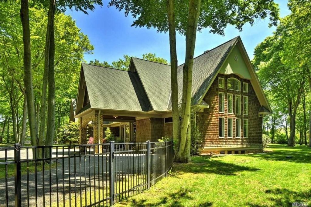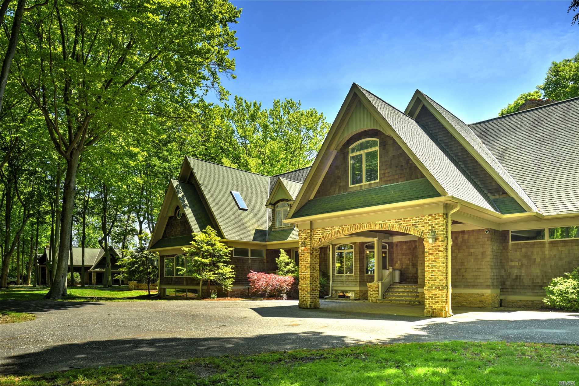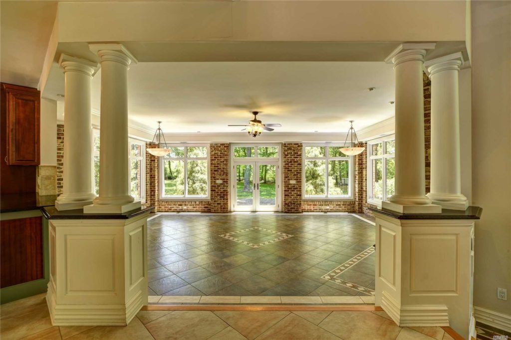 The five-bedroom, seven-bathroom Mattituck home is tucked away on a quiet five-acre lot. Travel down the long private driveway lined with birch trees to arrive at the grand entrance of the 7,500-square-foot estate.