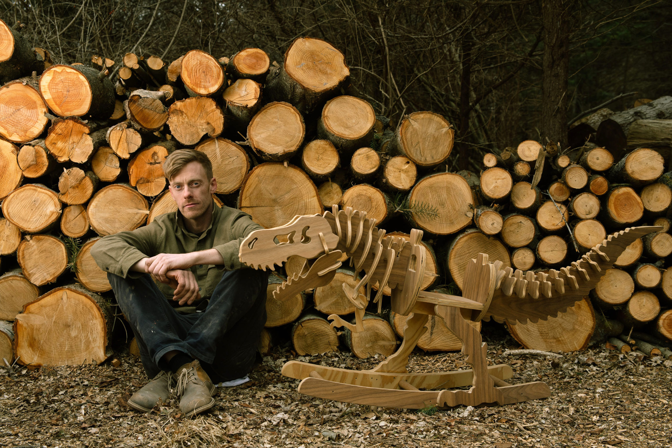 A single dad at an age when his friends are also having children, Saetta designs many pieces these days for those friends and their kids, like a dinosaur rocking chair he first made for one friend’s son. He also designs intricate name signs, which draw inspiration from the parents’ interests, often using upcycled materials influenced by music. Vinyl records, turntables and televisions are just some of the old products he’s incorporated into his designs. One of his current works is being made using skateboard decks.
