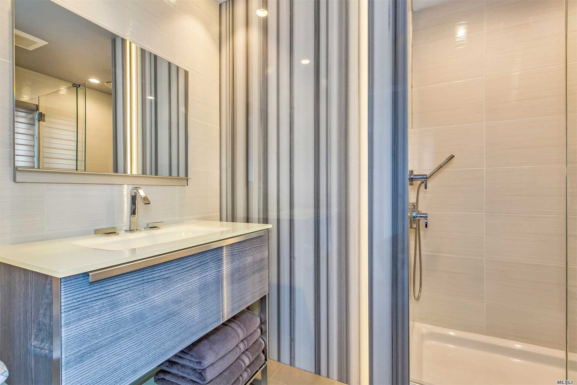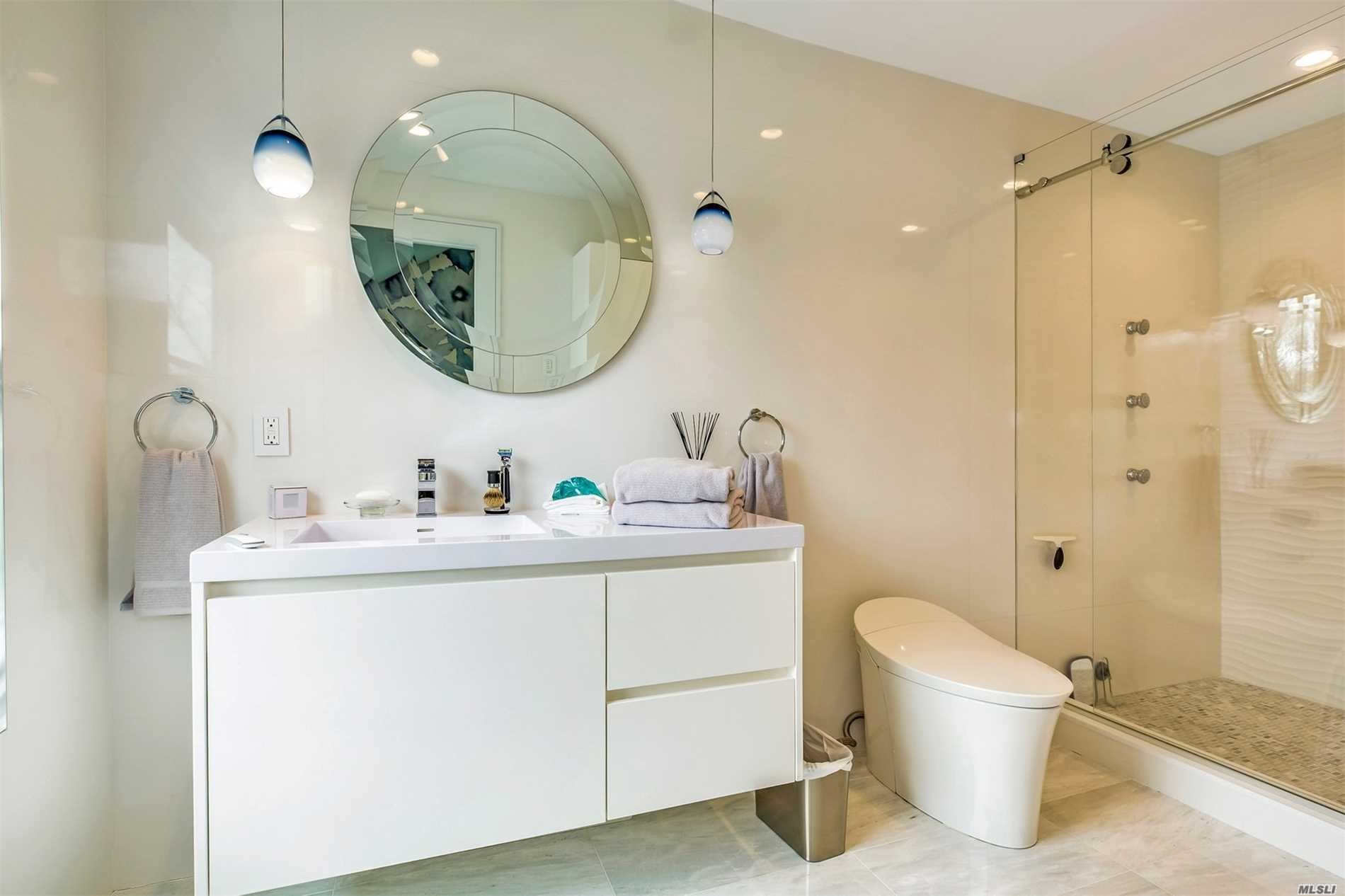 The amenities within this fully integrated smart home read like a wish list for a thoroughly modern homebuyer right down to the iPad controlled light and sound system. The calming interior with relaxing costal blue accents is polished with upgraded finishes such as a gas fireplace with a white Carrera marble façade, Italian porcelain tile on the first floor and TimberTech decking with stainless steel cable railings. A glass-enclosed mahogany and steel floating staircase leads to a private upstairs master wing with stunning views.