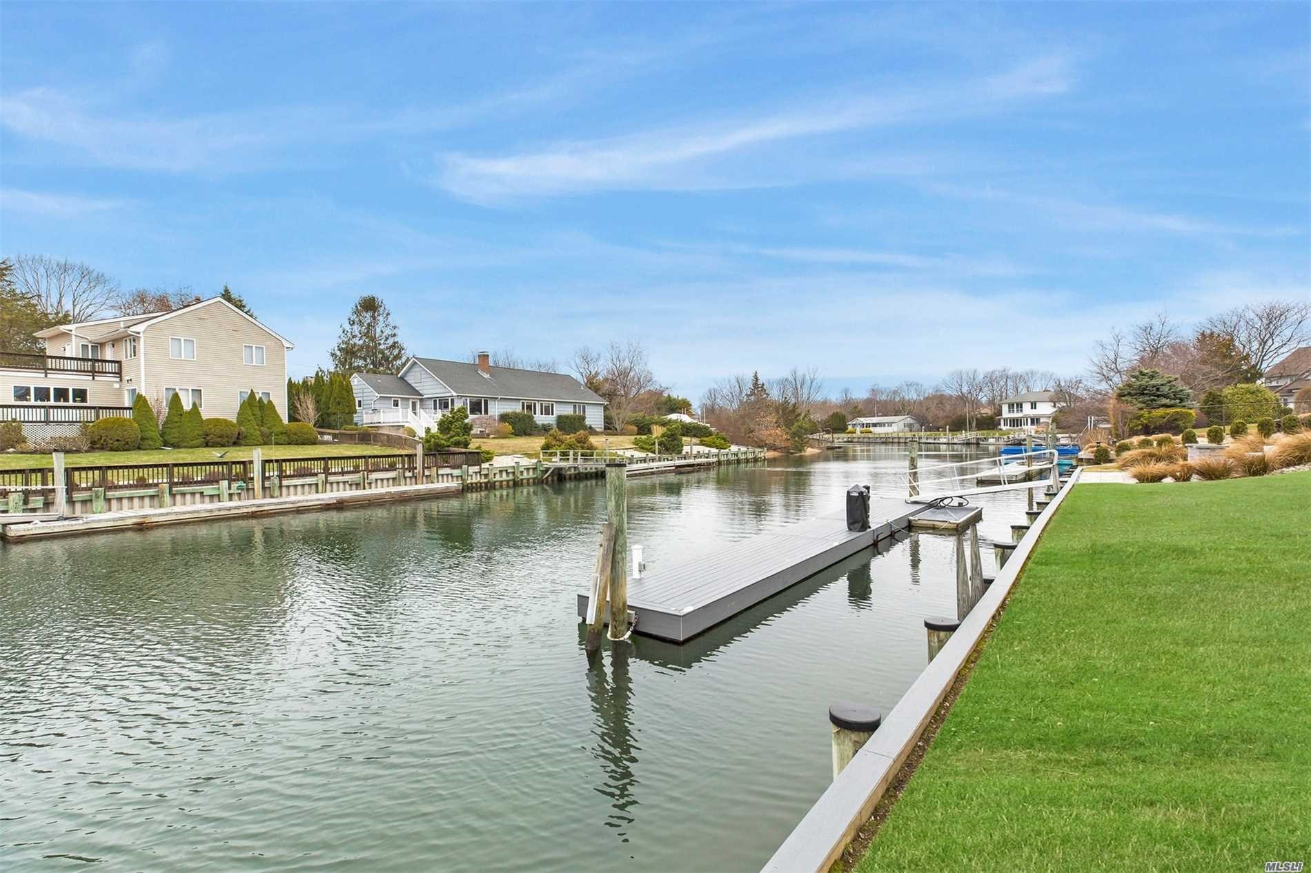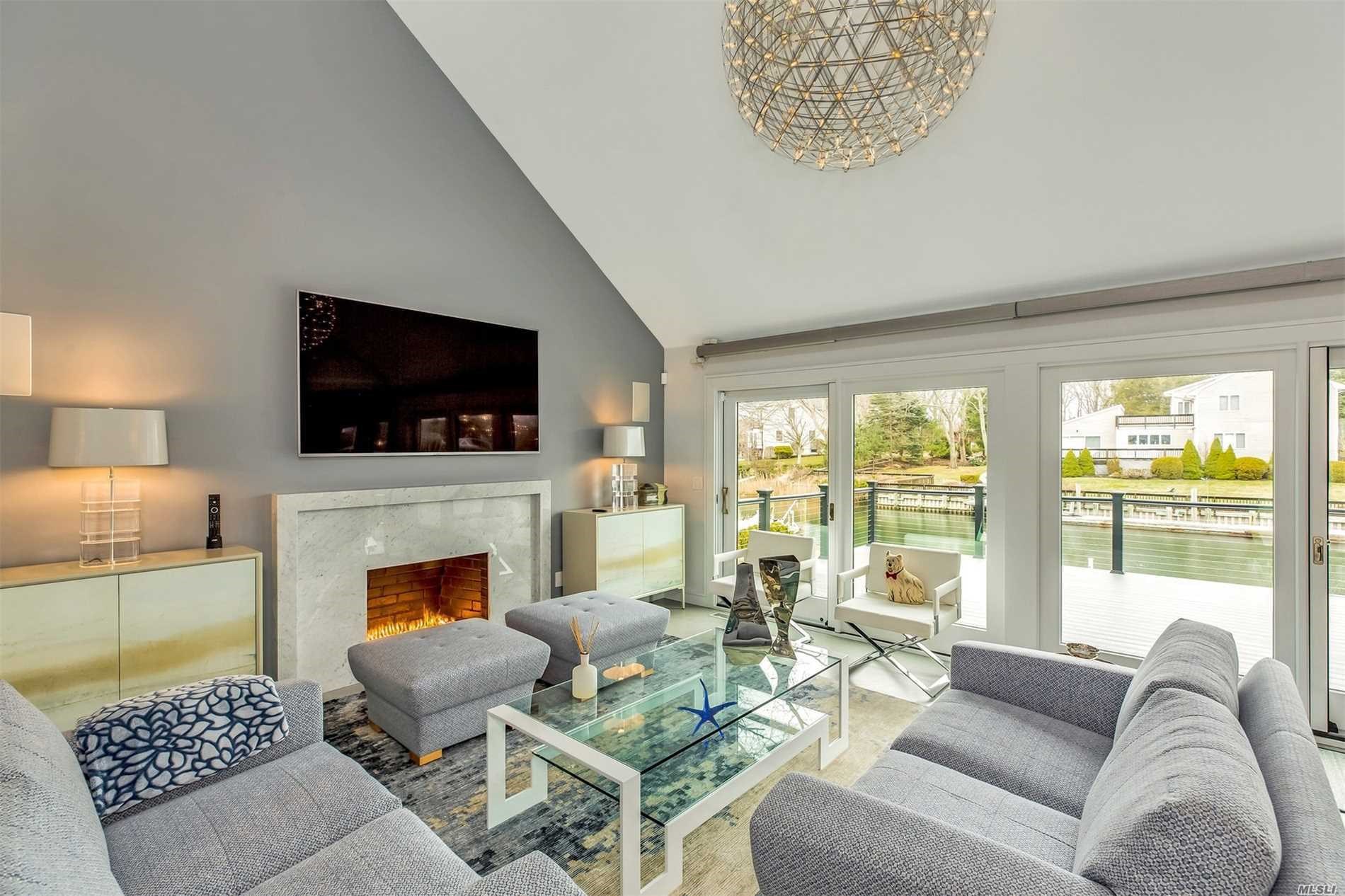 The three-bedroom, three-bath estate is a boater’s paradise with a deep water dock sited on a canal that leads to Gull Pond, which feeds into the Peconic Bay.
