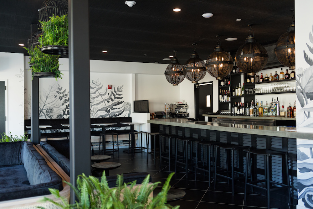 The ambiance matches the laidback culinary approach, with a modern-yet-moody setting. The seating is flexibly arranged to suit different gatherings — two long banquettes with small tables lend themselves to lounge-style dining, while marble tabletops create more of a traditional dinner setting. The black-and-white decor is complemented by hand-painted botanicals that span from floor-to-ceiling courtesy of local artist Kara Hoblin.