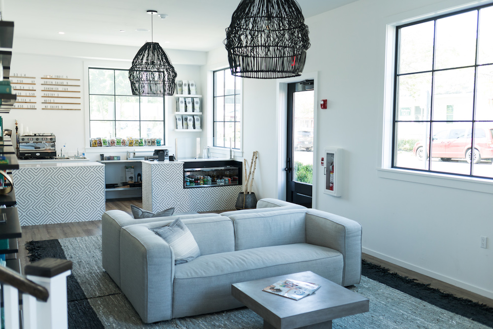 The light-filled café, which is open to the public, has a modern lounge feel with nautical undertones hidden throughout, combining clean lines, black lacquer and brass finishes with historic artifacts that were found during the property’s construction, including bricks, bottles, horseshoes and a mast from one of Greenport’s whaling ships.