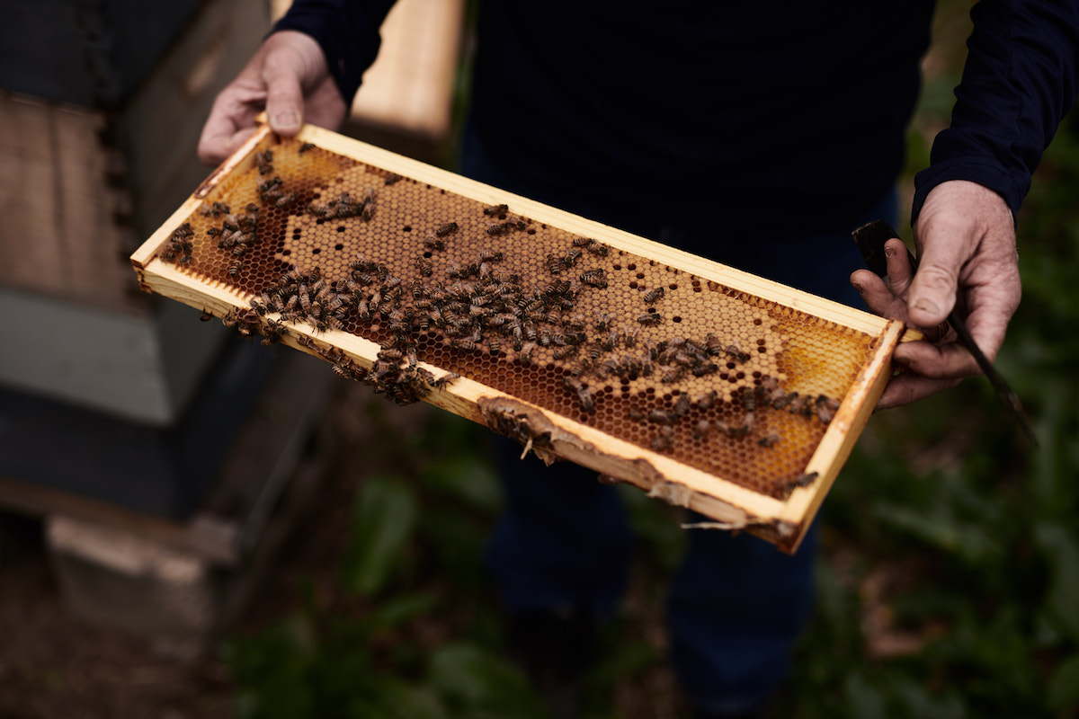 As the sun started to set over the back hill of his yard, Kelly pulled out one last frame from a hive. In it are no bees, but instead a thick layer of honey suspended in the honeycomb. He stuck his finger in it. The comb collapsed as the honey flowed down the frame. He moved his finger to his mouth and licked it.