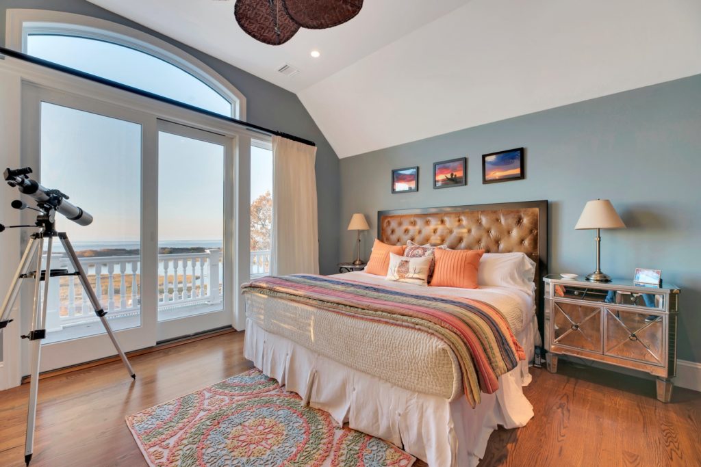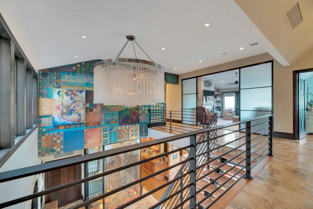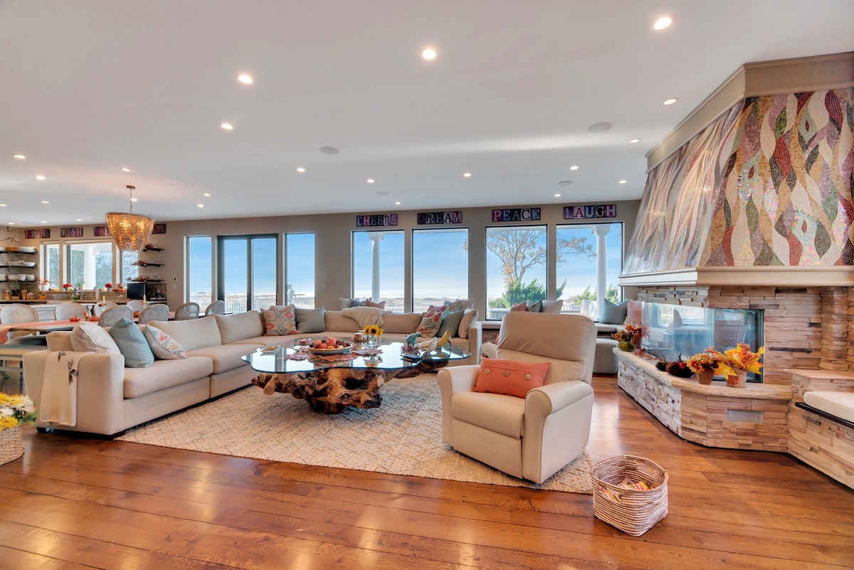 Professionally designed with six bedrooms, four full bathrooms and one half-bathroom, the home has an open floor plan throughout with expansive floor-to-ceiling glass windows and doors which provide panoramic water views from almost every room and dual-level views of mesmerizing sunsets.