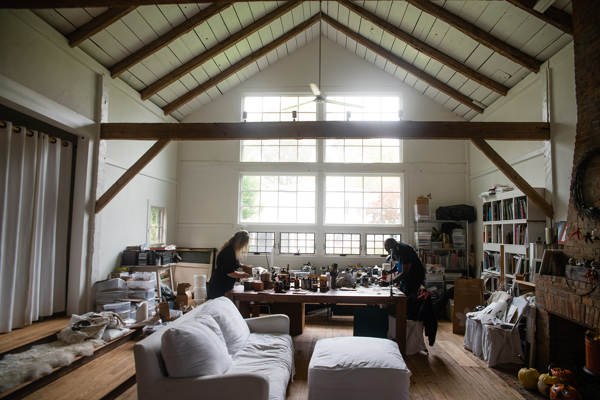 These days, they also look to their current setting for inspiration. Original wooden beams frame the high ceilings. Huge windows that face the south let in natural light that illuminate the entire space and frame the tree’s changing foliage just outside. The space, Rushforth-Worrell said, is a place where painters in the turn of the century would spend hours crafting. They even had the barn turned to face the south so the light would be best.