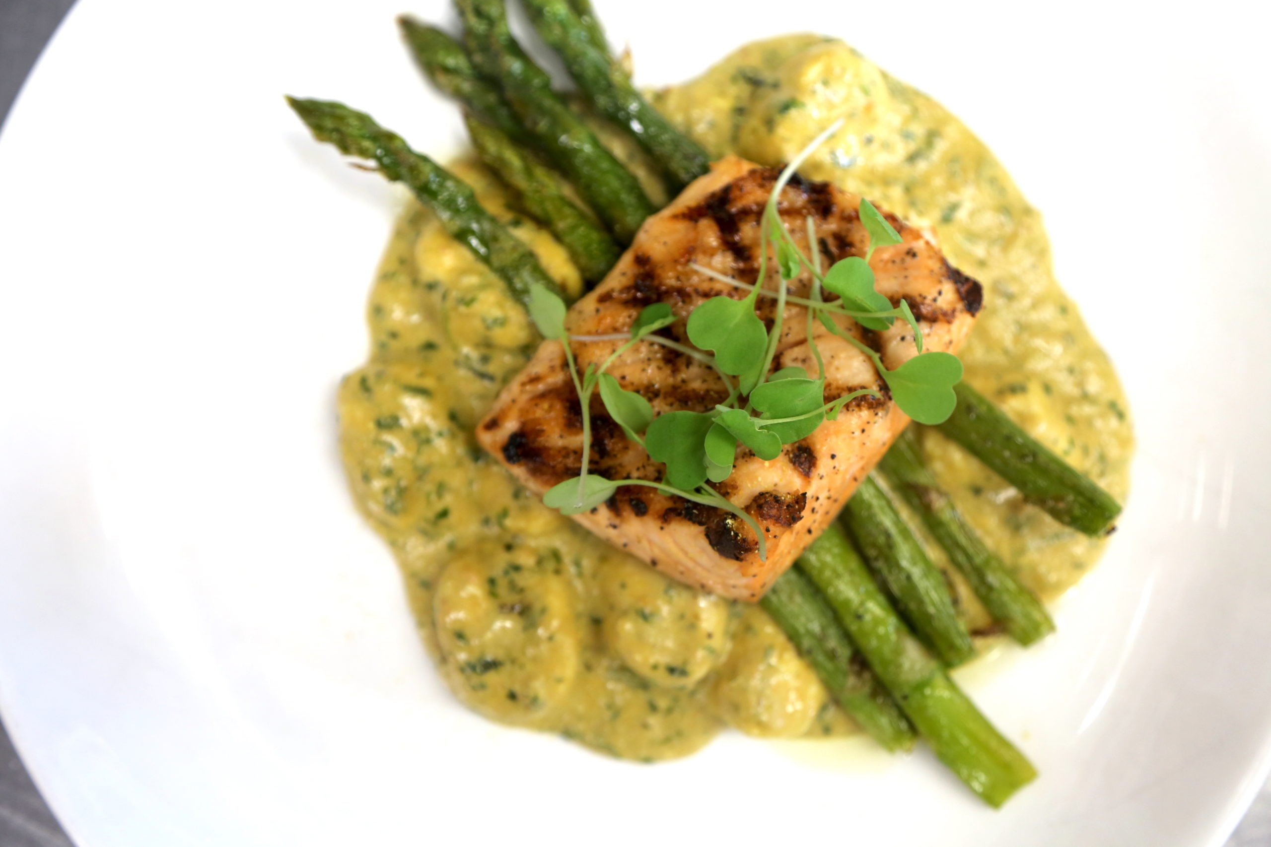 The gnocchi is served with asparagus and salmon and finished off with a dusting of dehydrated lemon zest.
