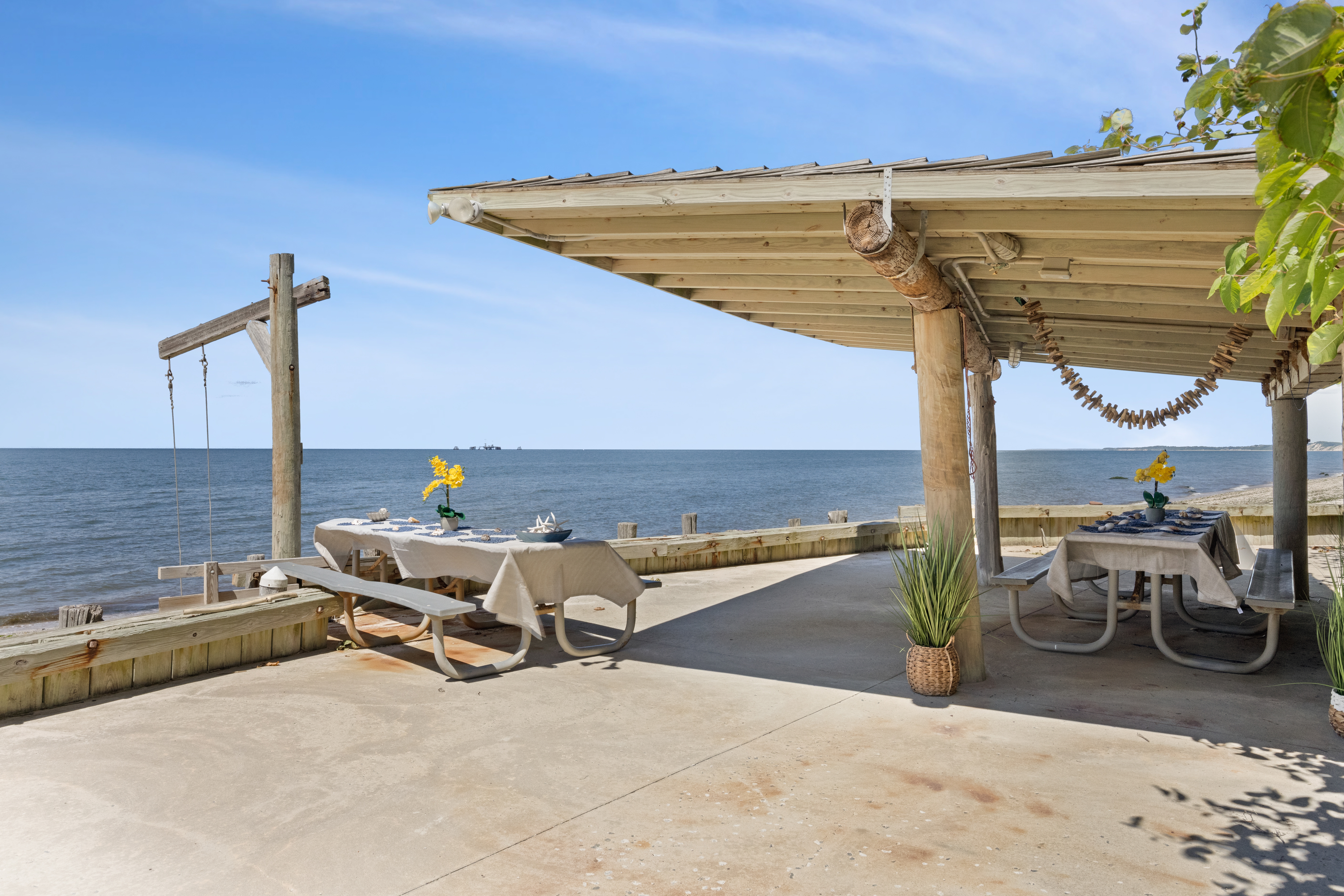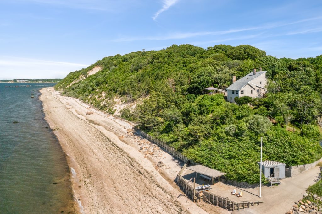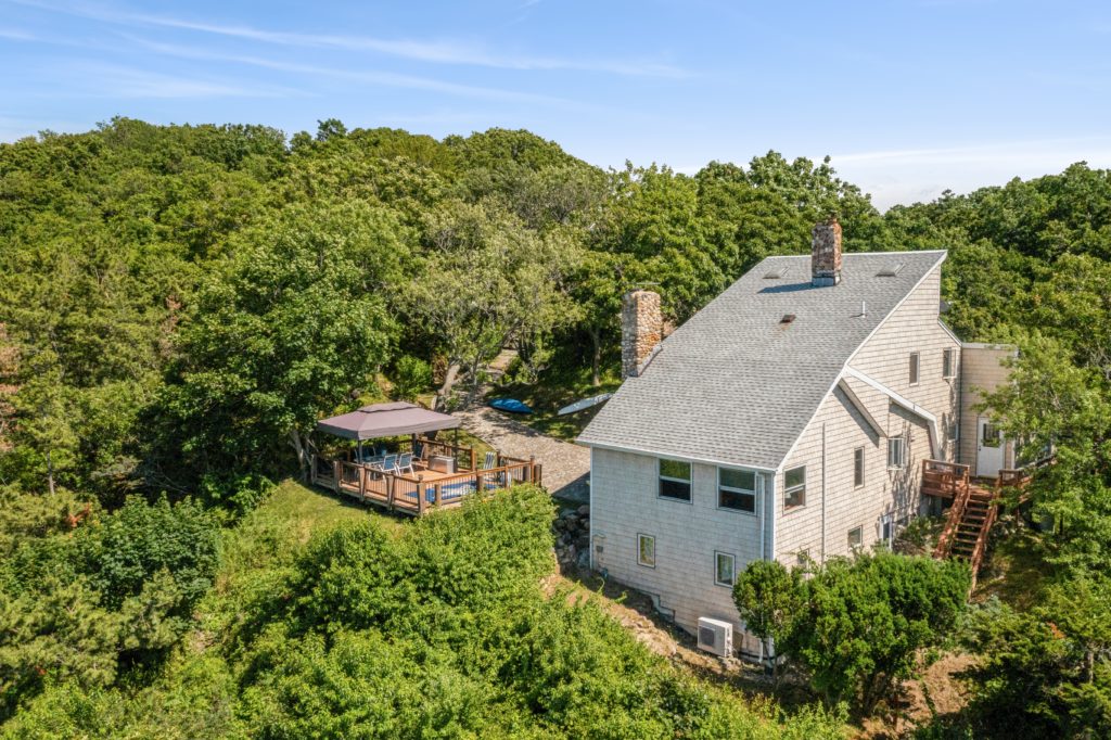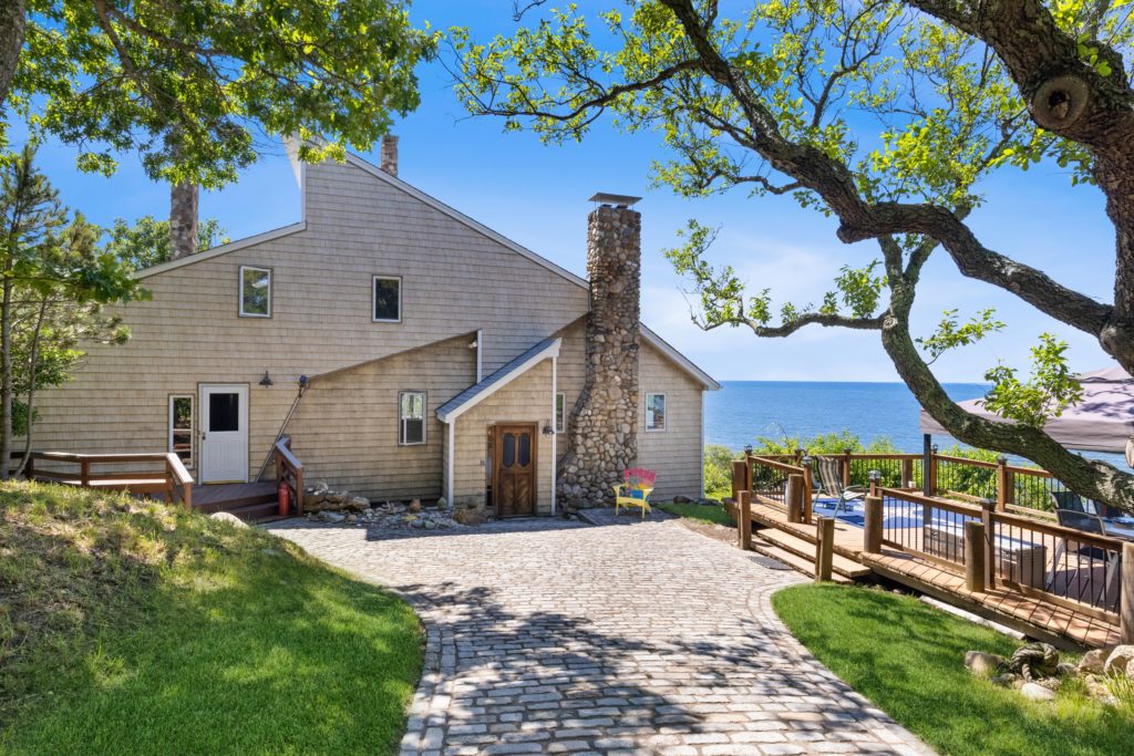 The three-bedroom, two-bathroom beach house is perched low on a bluff and includes multiple levels of outdoor space to enjoy including a gazebo terrace, a patio with a tiki hut, and beach frontage.