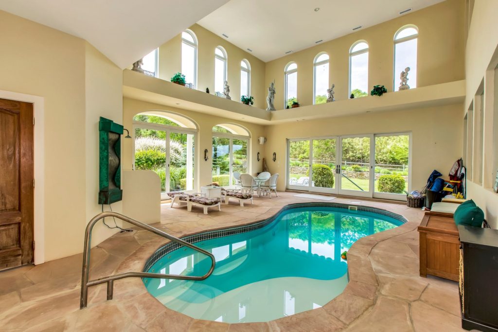 “The home is unique in that the layout is actually upside down from most other homes. The master suite and a Jack-and-Jill bathroom and bedrooms are located downstairs on the same level as the indoor pool with a full bath with steam shower as well as the professional home gym and fitness center,” added Flanigan.