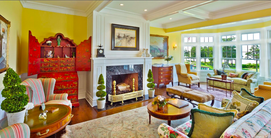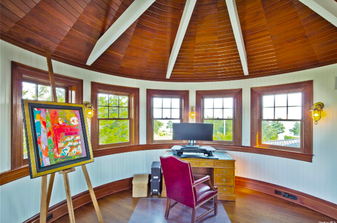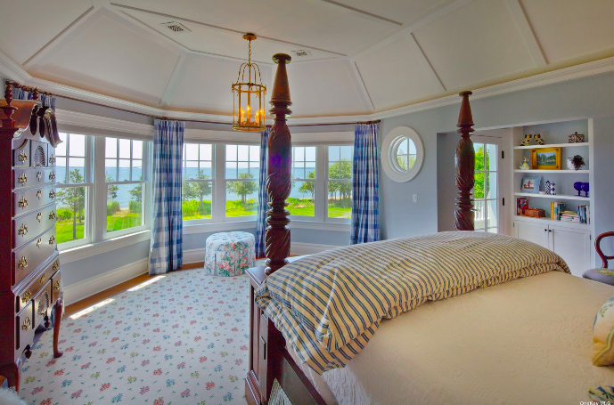 “My favorite room in the house is the sunroom,” said co-listing agent Carol Szynaka of Daniel Gale Sotheby’s International Realty. “A round room with bluestone floors, warmed by radiant heat and a wood-burning fireplace. Enclosed by either glass or screen trimmed in beautiful mahogany trim with high ceilings and decorated in seaside stripes & fabrics. I would be happy in this room all year long.”