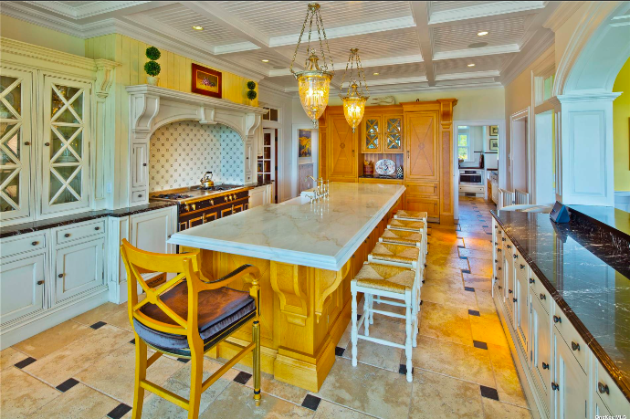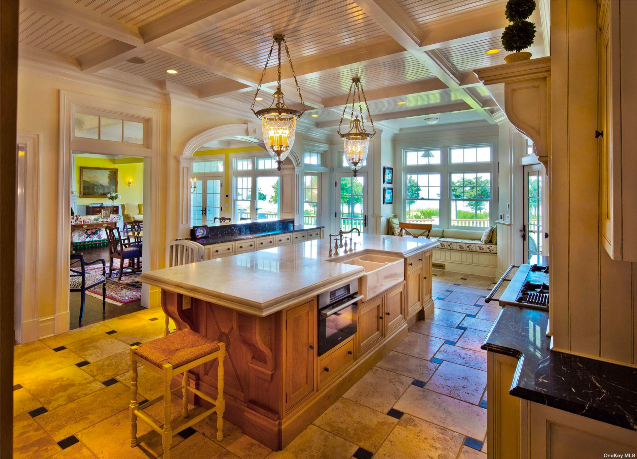 Built with high-quality materials the home boasts a timeless and classic design and features five bedrooms, seven bathrooms, a Clive Christian kitchen outfitted with a La Cornue gas stove, Sub Zero, and Miele appliances, as well as two offices, a mahogany library, four fireplaces, a sunroom, and more.