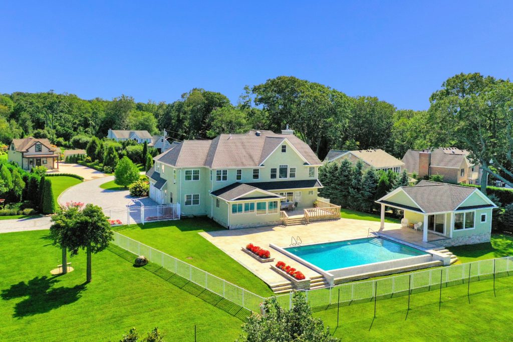 Perched on a bluff in Riverhead the property includes a five-bedroom, four-bathroom main house, a pool house, and a detached two-car garage each containing high-end natural materials.
