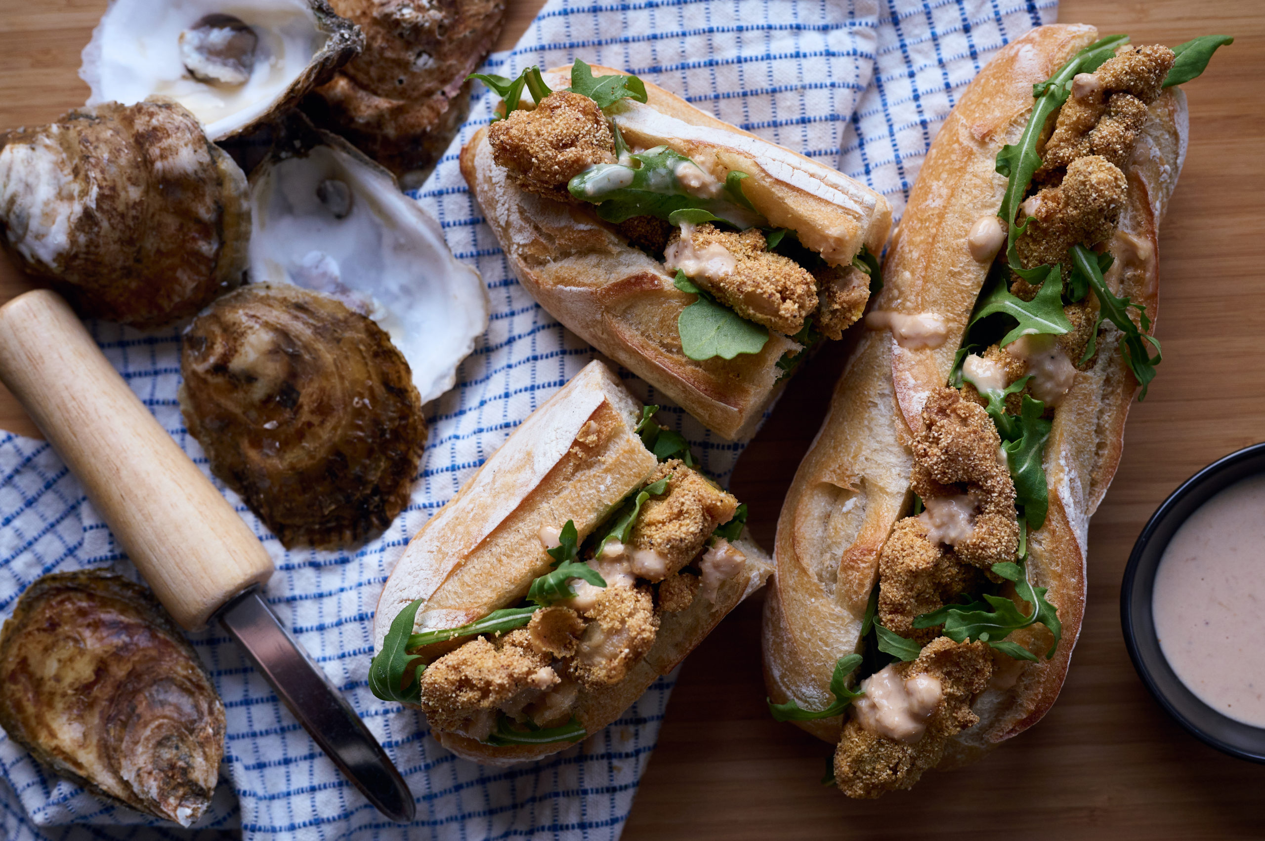 - Place 4-6 fried oysters between the halves of each roll, and tuck in some arugula.