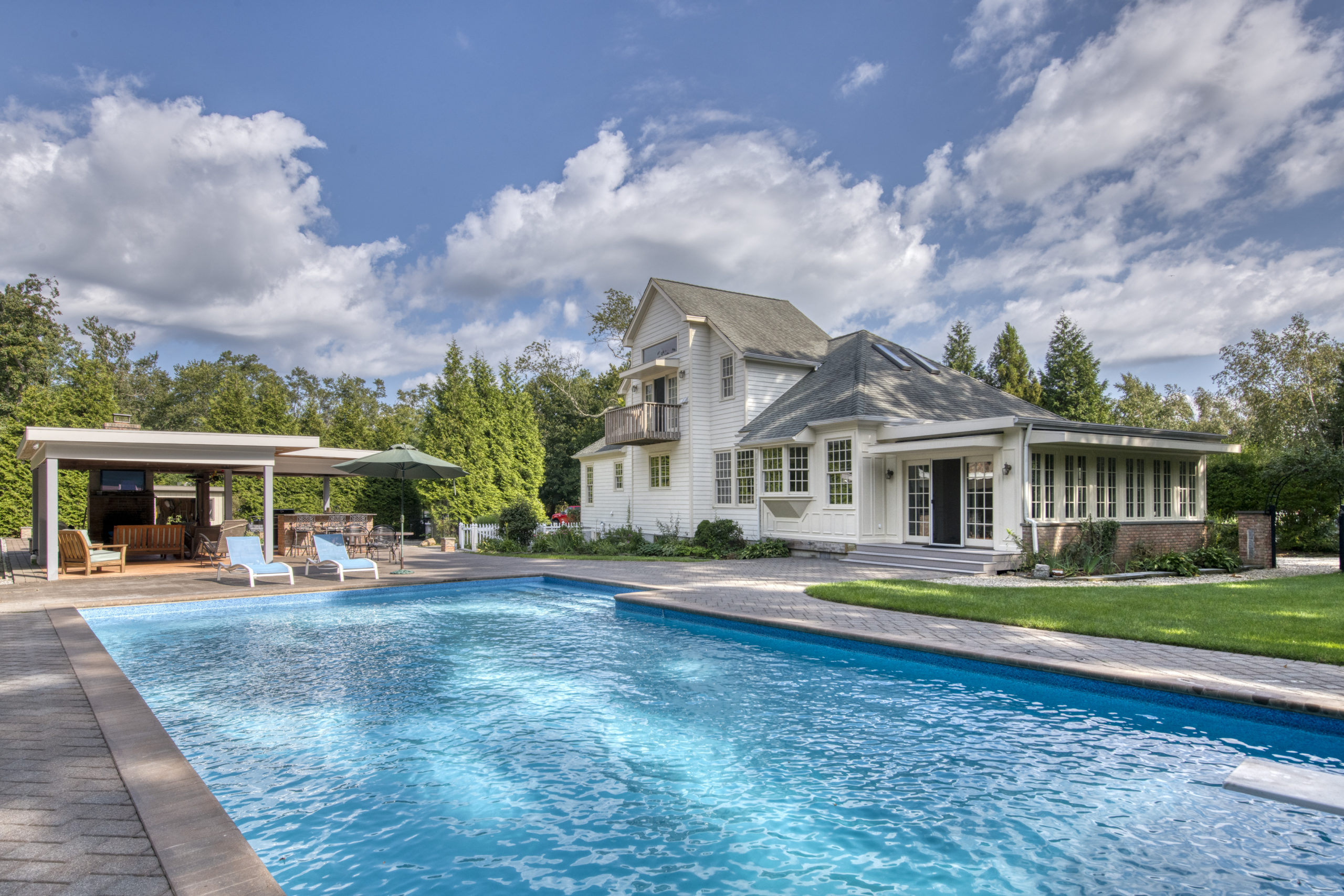 “This post-modern East Marion home has extensive hardscape and landscape. The backyard entertainment area includes an in-ground pool and a giant patio. There’s a bocce ball court, an outdoor kitchen, and bar, and a generous brick fireplace with a covered lounge area for cool evenings spent poolside,” said listing agent Joseph DiVello of Century 21 Albertson Realty.
