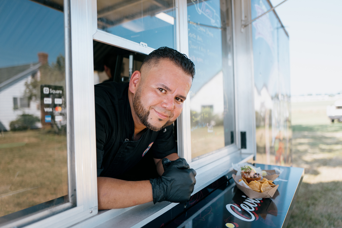 Inside, you’ll see chef Balo Alvarez meticulously preparing a ceviche, combining perfectly tender shrimp, baby octopus and squid with fresh tomatoes, jalapeños, onion and lemon juice to add bright acidity. He grabs a handful of micro cilantro, tearing pieces of the tiny herb for a pungent, peppery garnish before serving it all up with homemade chips through the window.