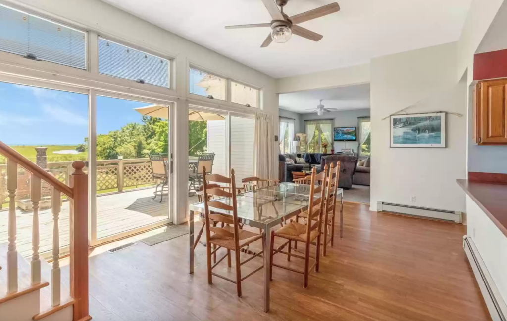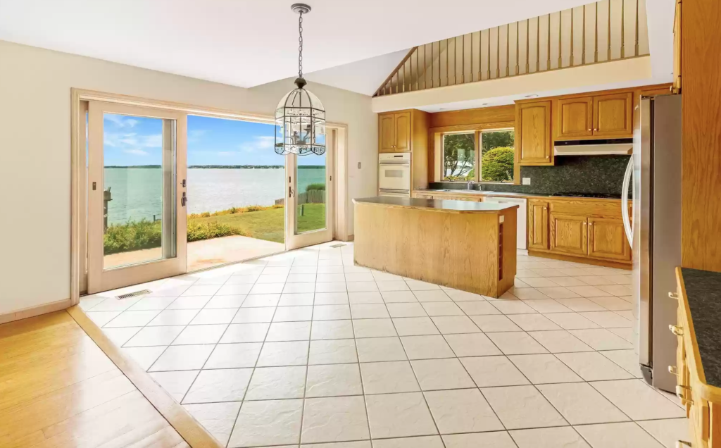 This open-concept home has four bedrooms, three-and-a-half bathrooms, 130 feet of waterfront views of Shelter Island, the Bug Light, Greenport village, and Gardiners Bay. It’s listed by William Walters of Daniel Gale Sotheby’s International Realty.