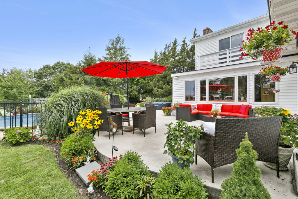 The patio that’s surrounded by established plantings features a hot tub and plenty of space for outdoor dining and enjoyment.